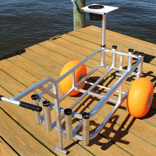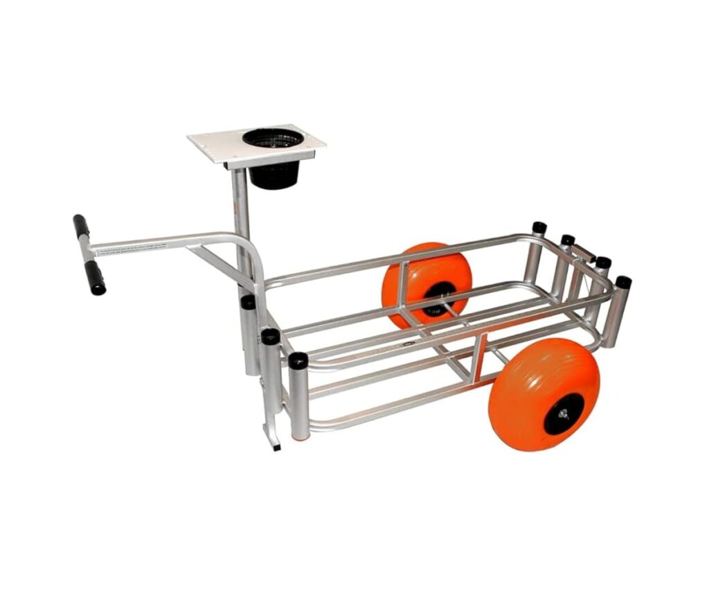 A compact and lightweight option, this cart accommodates up to 5 rods and a 36–48 qt cooler, perfect for solo or small-group fishing trips.